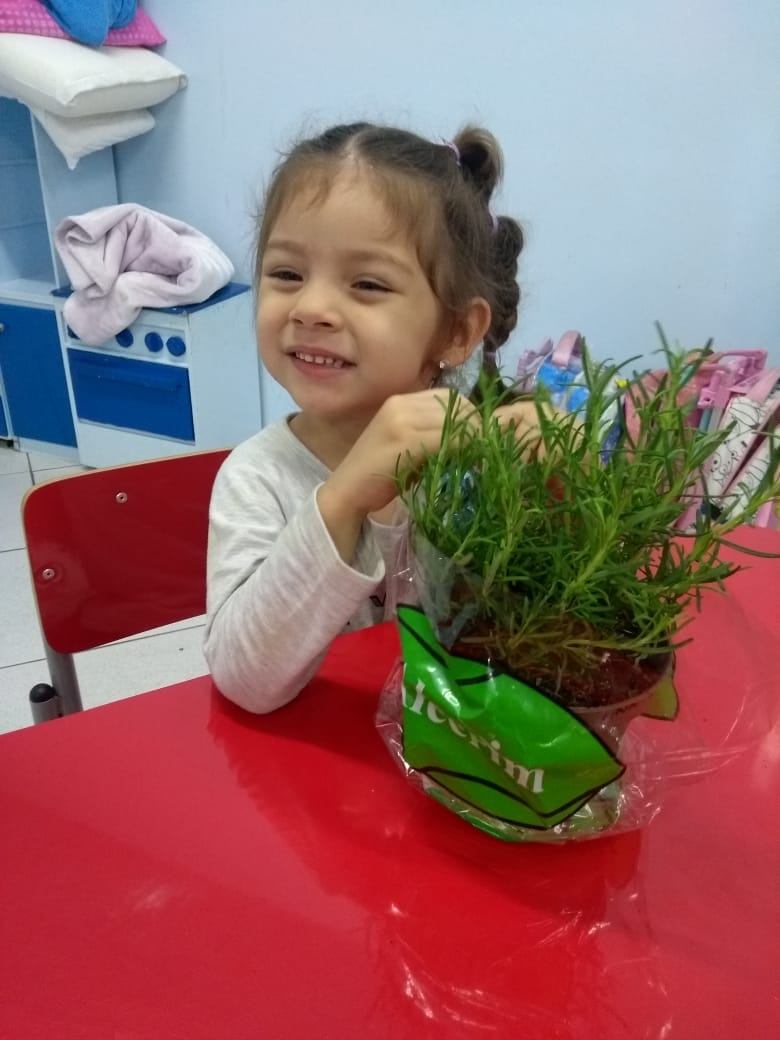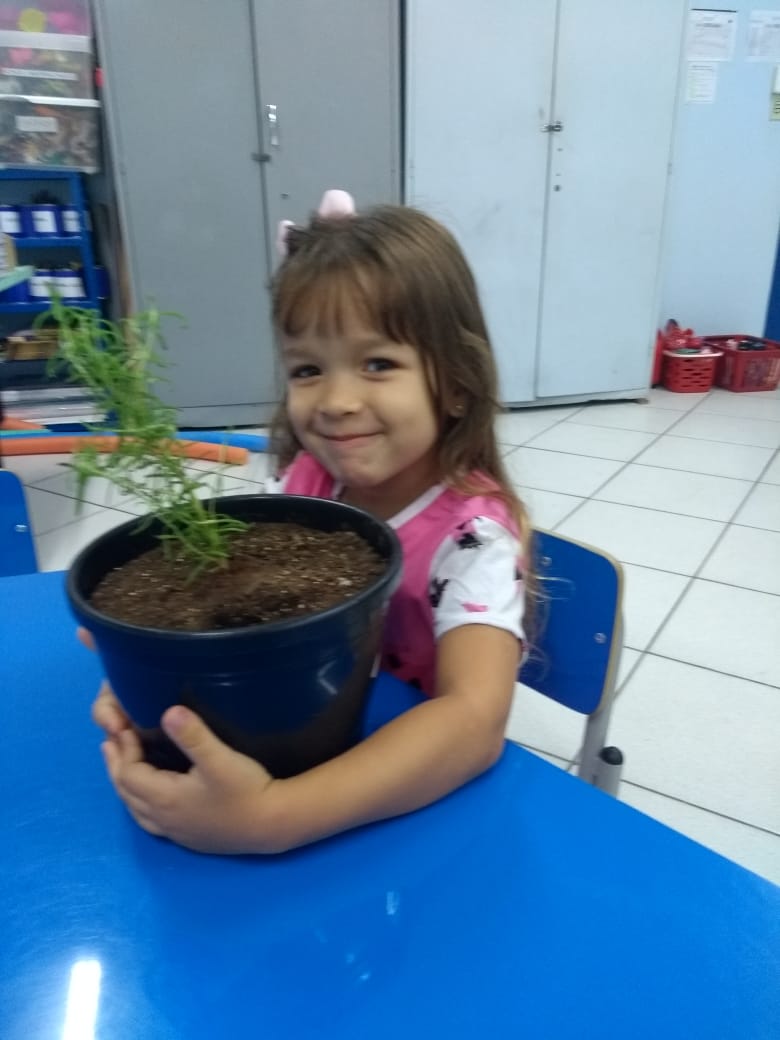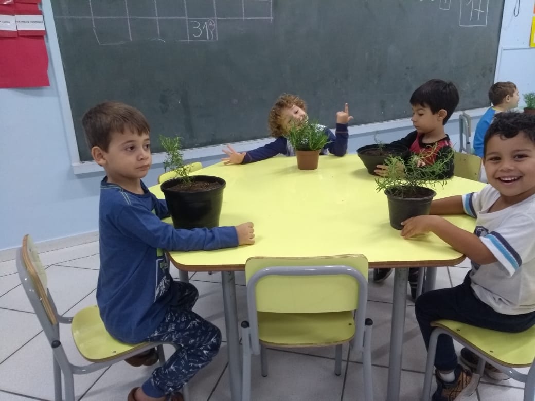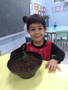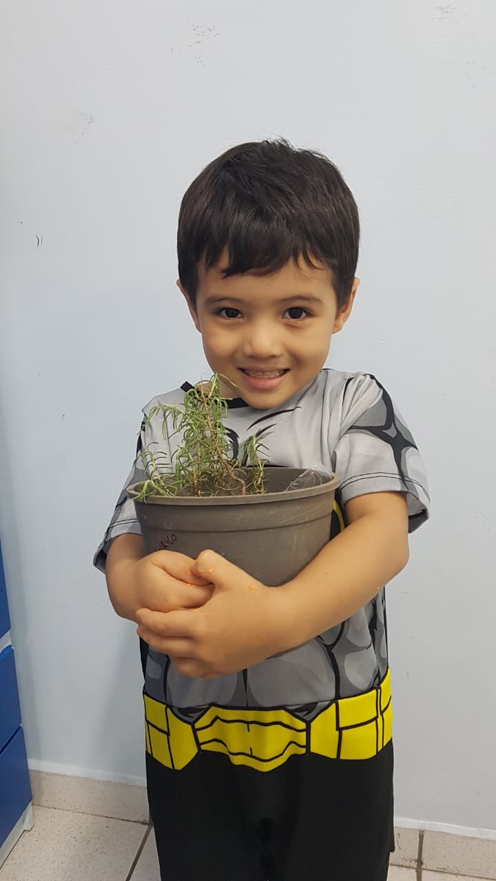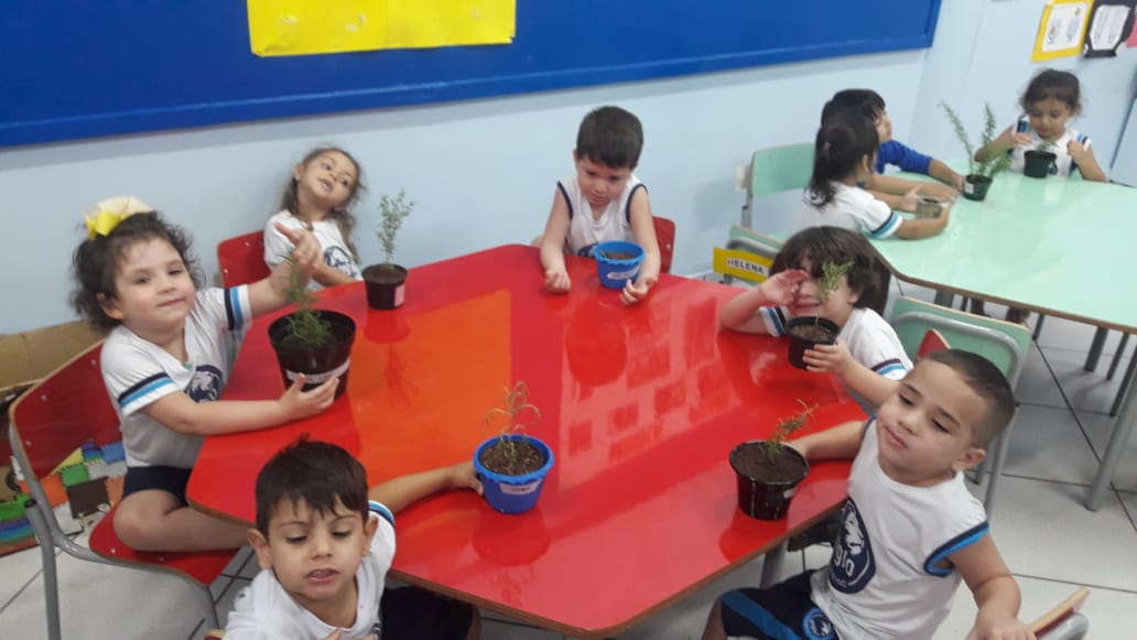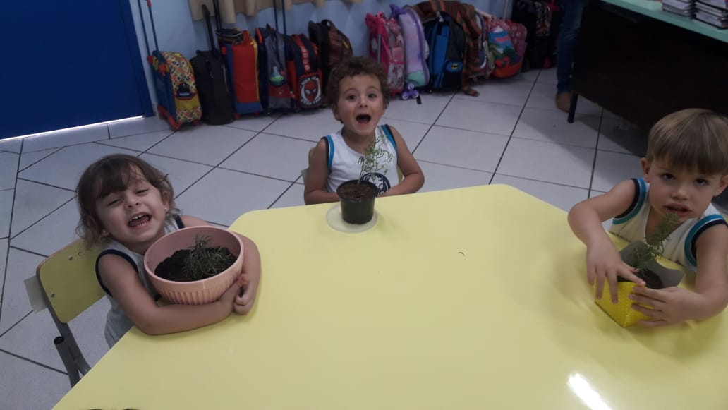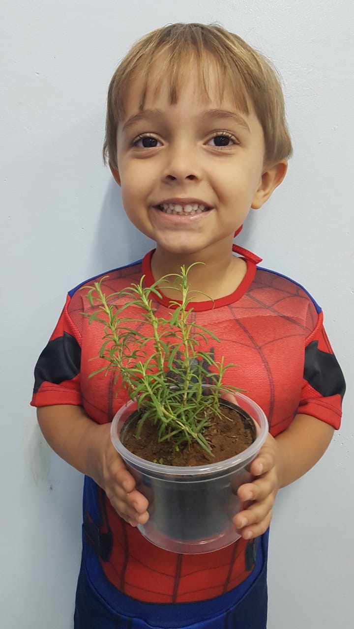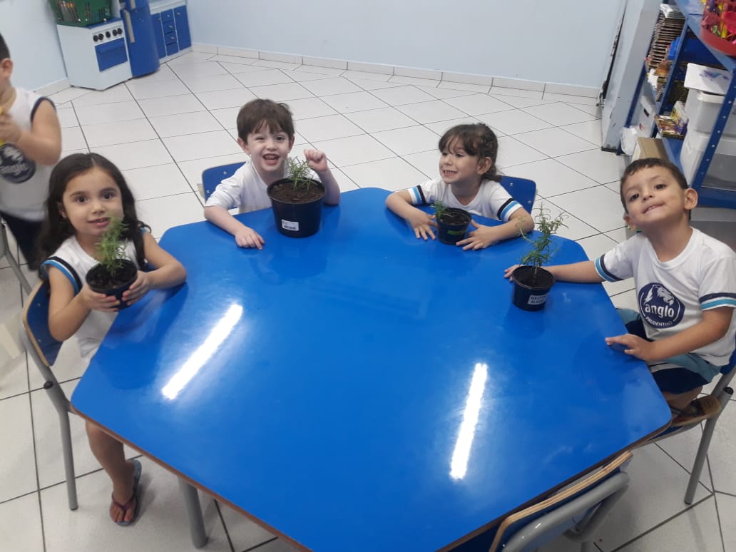 Para enriquecer as vivências de atividades do Caderno Anglo 3, os alunos do Infantil 2, das turmas das professoras Andressa, Jéssica e Roberta, plantaram e cuidaram de mudinhas de alecrim em casa com a ajuda de seus familiares. Depois, enviaram o trabalho para a escola e apresentaram aos colegas. Confira que fofuras!