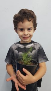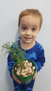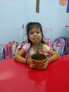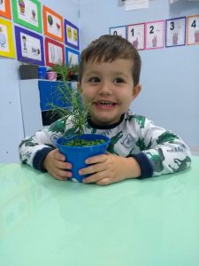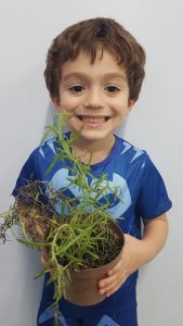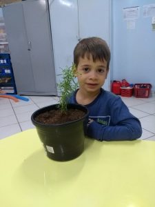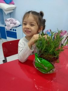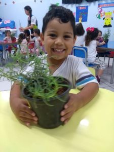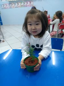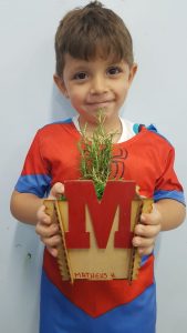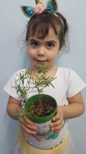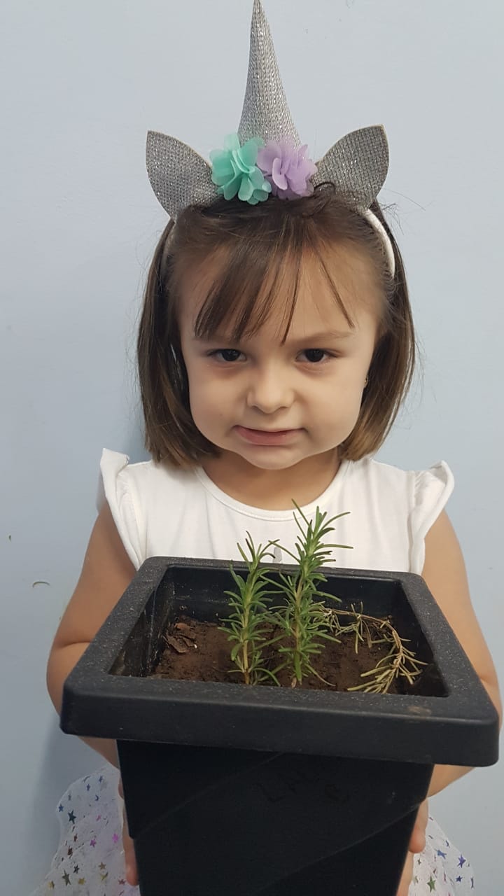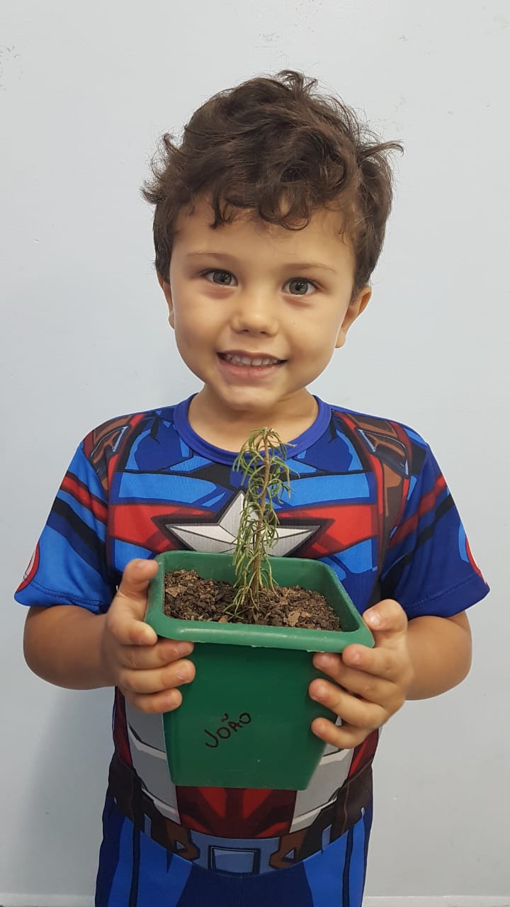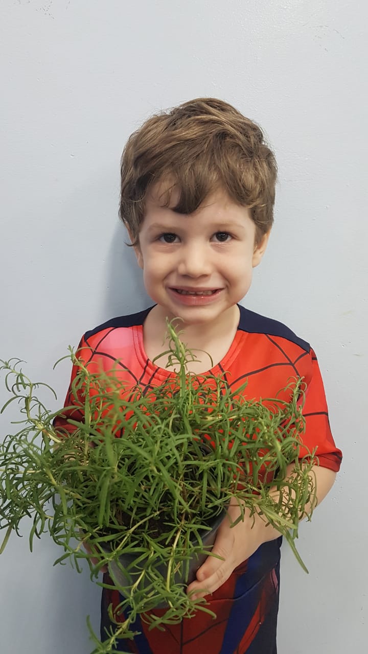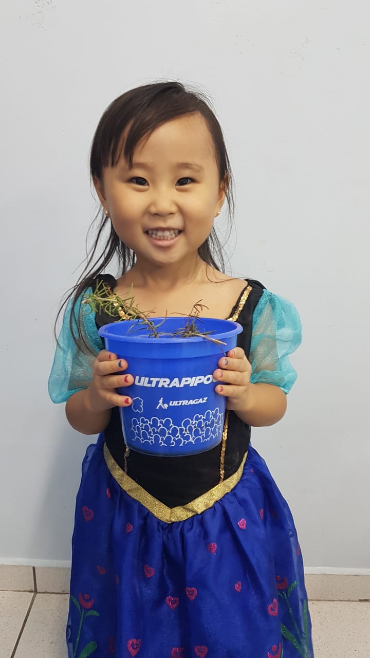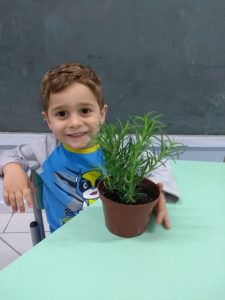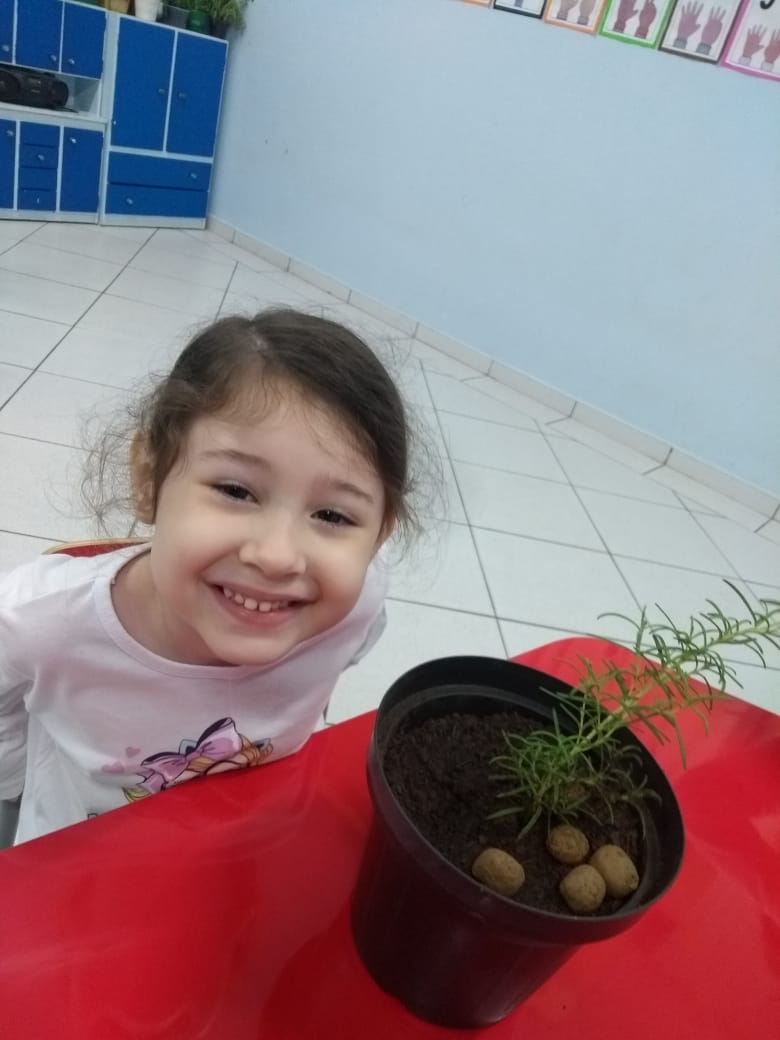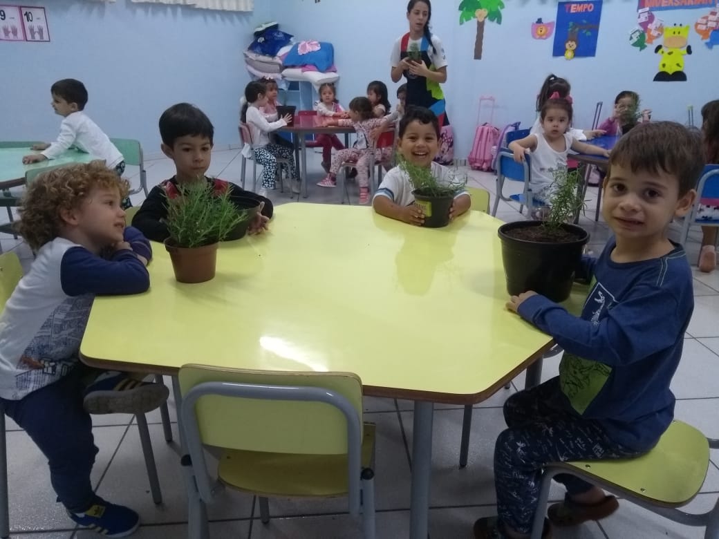 Para enriquecer as vivências de atividades do Caderno Anglo 3, os alunos do Infantil 2, das turmas das professoras Andressa, Jéssica e Roberta, plantaram e cuidaram de mudinhas de alecrim em casa com a ajuda de seus familiares. Depois, enviaram o trabalho para a escola e apresentaram aos colegas. Confira que fofuras!
